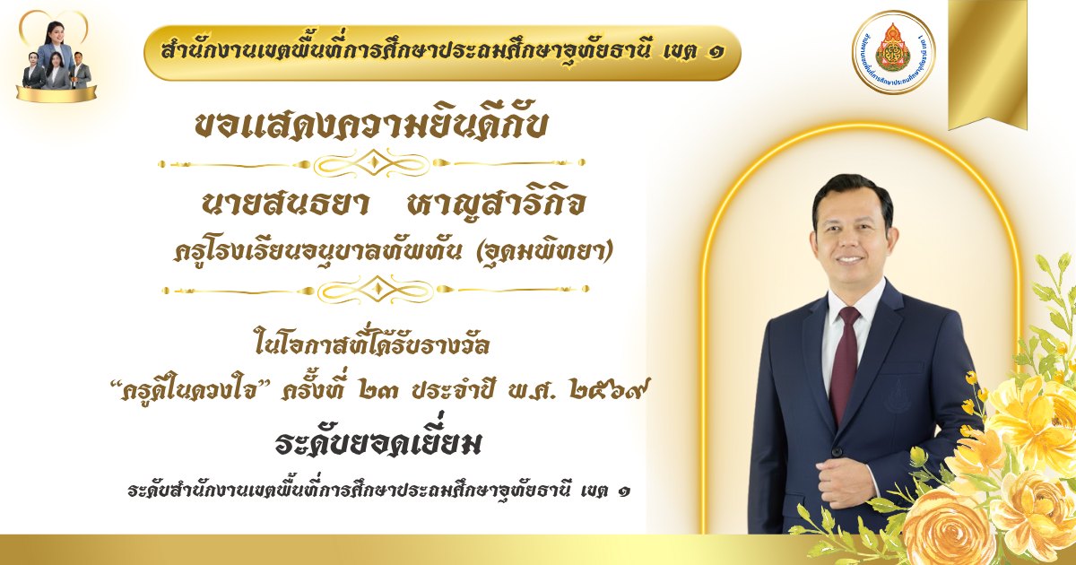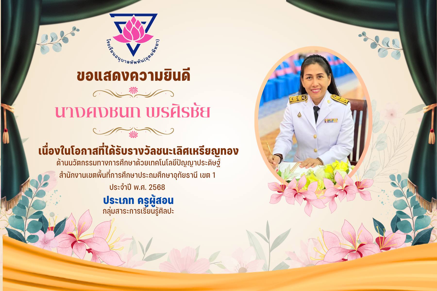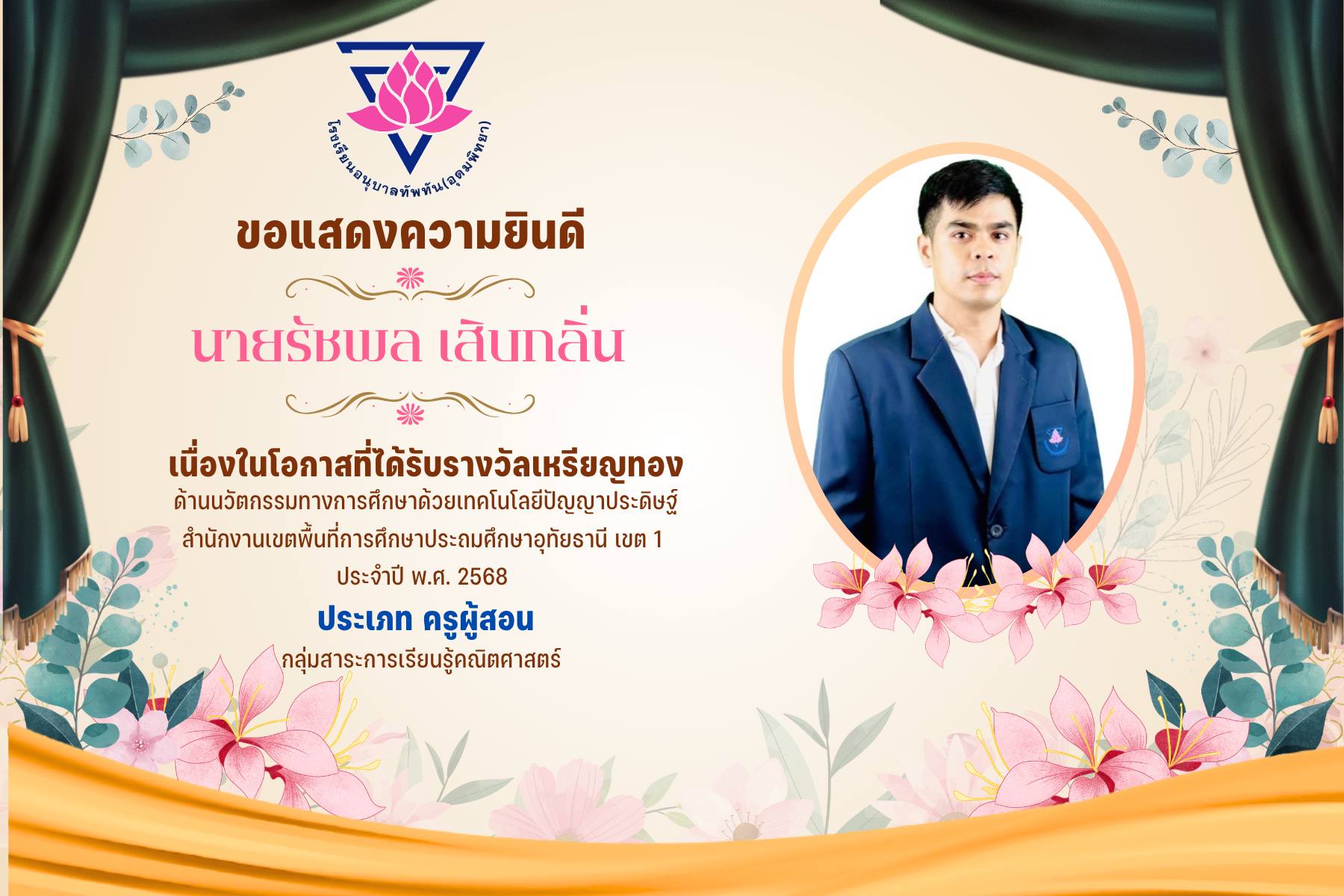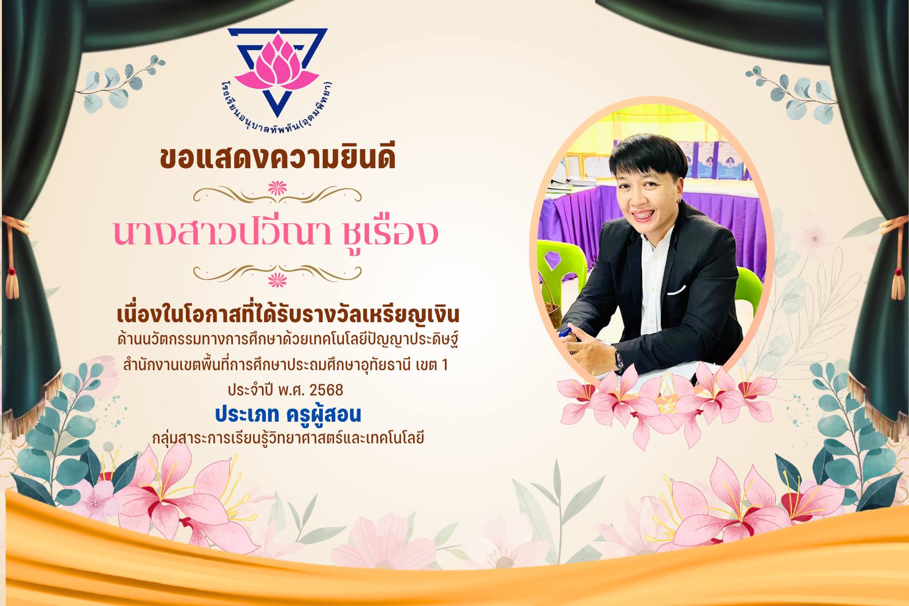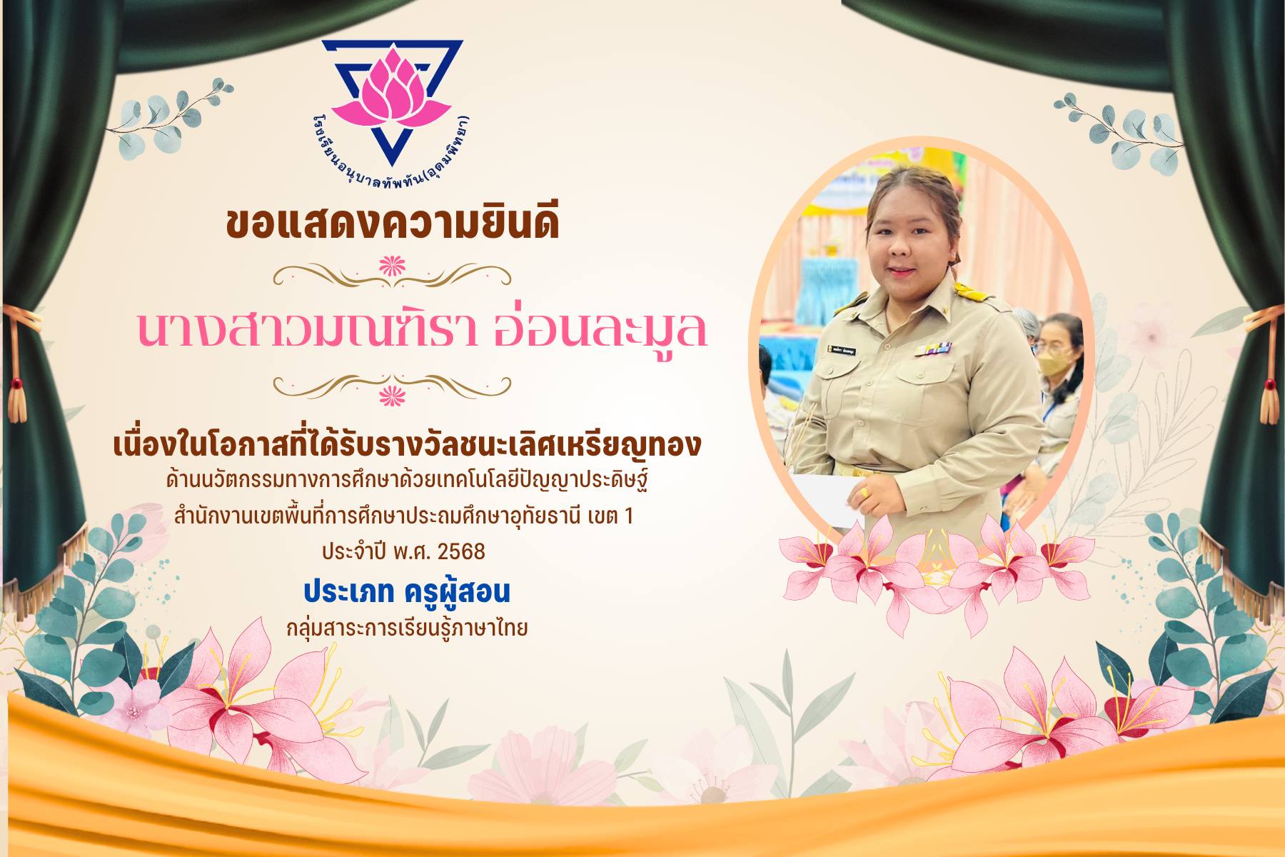 ได้รับรางวัลชนะเลิศ เหรียญทอง กลุ่มสาระภาษาต่างประเทศ ด้านนวัตกรรมทางการศึกษาด้วยเทคโนโลยีปัญญาประดิษฐ์ ประเภทครูผู้สอน สำนักงานเขตพื้นที่การศึกษาประถมศึกษาอุทัยธานี เขต 1 ประจำปี พ.ศ.2568 |